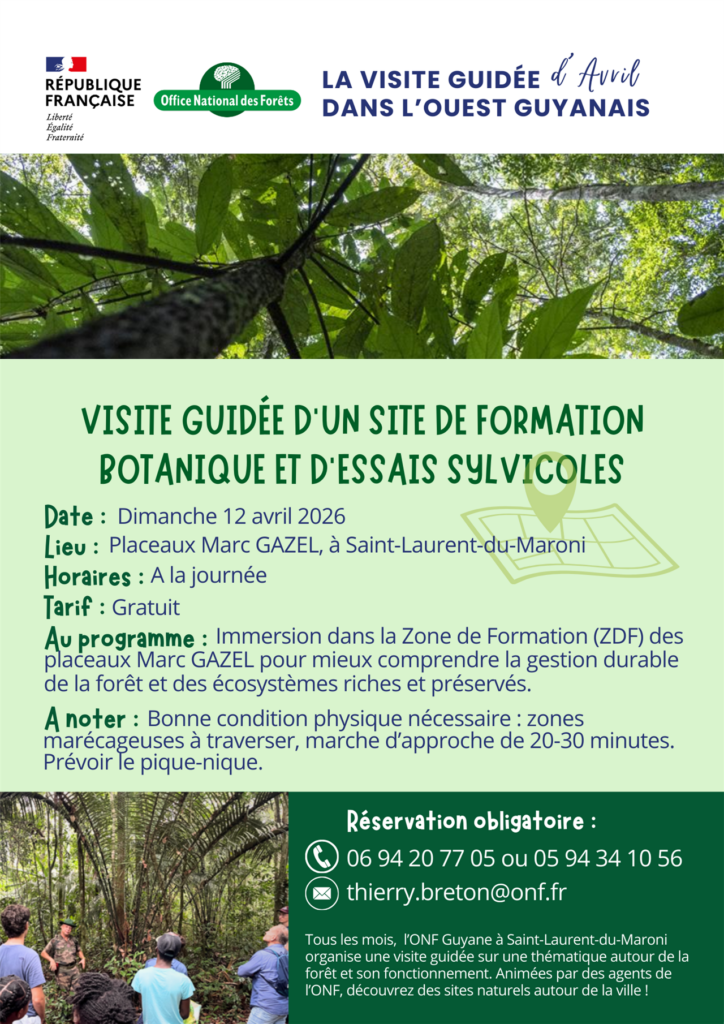 VOTRE VISITE GUIDEE D’AVRIL A SAINT-LAURENT-DU-MARONI Comme chaque mois, l’Office National des Forêts vous propose une visite guidée à thématique pour découvrir la forêt à Saint-Laurent-du-Maroni. Pour cette visite d’avril, le maître-mot sera D-E-C-O-U-V-E-R-T-E ! Au programme, une journée d’immersion dans la Zone de Formation (ZDF) des placeaux Marc GAZEL pour mieux comprendre la gestion durable de la forêt et des écosystèmes riches et préservés. Infos pratiques : • Dimanche 12/04/2026 • Rendez-vous à l’office du tourisme de Saint-Laurent-du-Maroni • Sur la journée • Tarif : gratuit